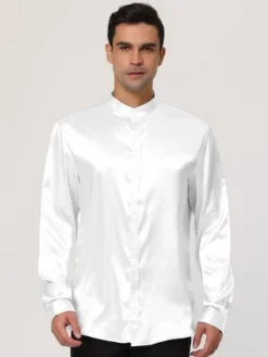 Lars Amadeus Men’s Satin Long Sleeves Band Collar Button Down Solid Prom Satin Shirts