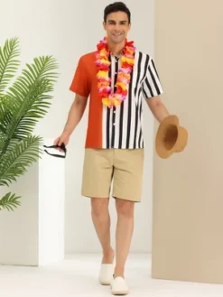 Lars Amadeus Men’s Stripe Shirt Short Sleeved Color Block Button Down Beach Shirt