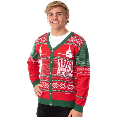 - FUN DESIGN – This knit sweater has a fun, holiday-themed, Buddy the ELF ugly Christmas sweater design. The interwoven design has a Narwhal character and “Cotton Headed Ninny Muggins” script and holiday designs. You can wear this button-up sweater with your favorite pair of jeans or as part of your pajamas