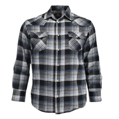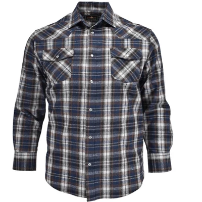 Falcon Bay men’s western style yarn dyed cozy soft midweight flannel shirt. Long sleeve, point collar, two flap chest pockets with pearl snaps. Front and back yokes with pearl snap cuffs and snap front. Extra soft blend of 55% cotton/ 45% polyester, machine washable.