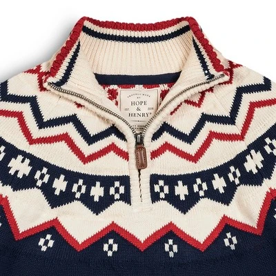Make a statement this winter in our handsome half zip ski sweater. Features a front half zip at the cozy mock neck in our signature organic cotton yarns, raglan sleeves, and a striking geometric fair isle design at the shoulders. Rib knit at the collar, cuffs, and hem with contrast tipping. Pairs perfectly with our collection of classic organic cotton button downs.