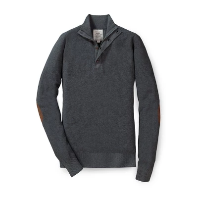 This stylish mock neck pullover in soft organic cotton will be a staple in your cool weather wardrobe. Features sporty sleeve stripes, tonal elbow patches, rib trim, and a cool button placket.
