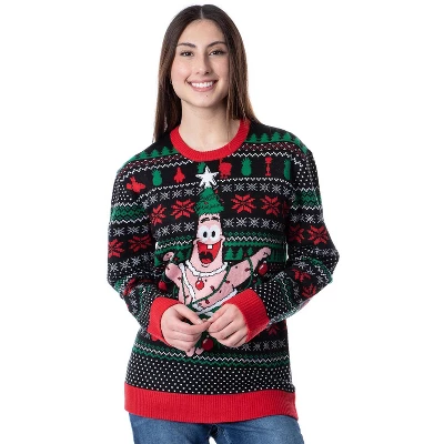 - FUN DESIGN – This knit sweater has a fun holiday-themed SpongeBob SquarePants Patrick ugly sweater design. The interwoven design has Patrick as a Christmas tree, character silhouettes, and holiday designs. You can wear this pullover sweater with your favorite pair of jeans or as part of your pajamas