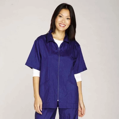 Shirt-style Top Performance Grooming Jackets feature a smooth, nylon-coil front zipper, elbow-length sleeves, and two large front pockets. Machine washable for easy care.